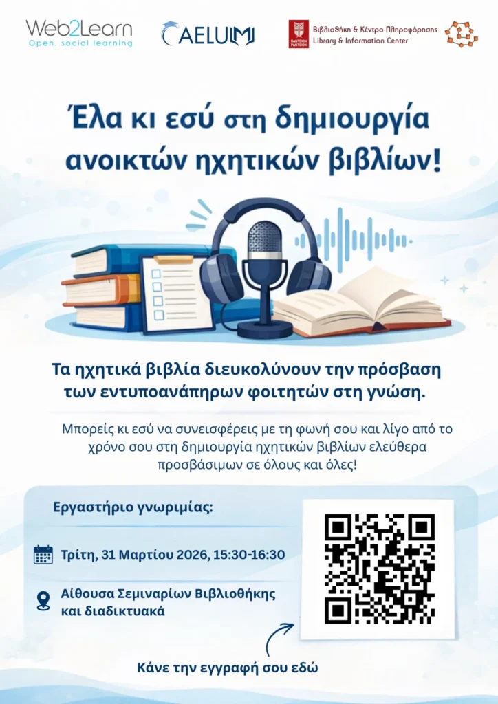 Στο πλαίσιο αυτών των δράσεων, έχει οργανωθεί εργαστήριο που θα λάβει χώρα την Τρίτη, 31 Μαρτίου 2026, από τις 3:30 μμ. έως τις 4:30 μμ., στην αίθουσα Σεμιναρίων της Βιβλιοθήκης του Παντείου Πανεπιστημίου και διαδικτυακά μέσω Zoom. Στο εργαστήριο θα παρουσιαστεί η διαδικασία της παραγωγής ηχητικών βιβλίων και θα μιλήσουν για τις εμπειρίες τους εθελοντές που δημιούργησαν τα πρώτα ηχητικά βιβλία. Μπορείτε να μάθετε περισσότερα για τη δράση εδώ και να κάνετε την εγγραφή σου για το εργαστήριο στις 31 Μαρτίου εδώ.