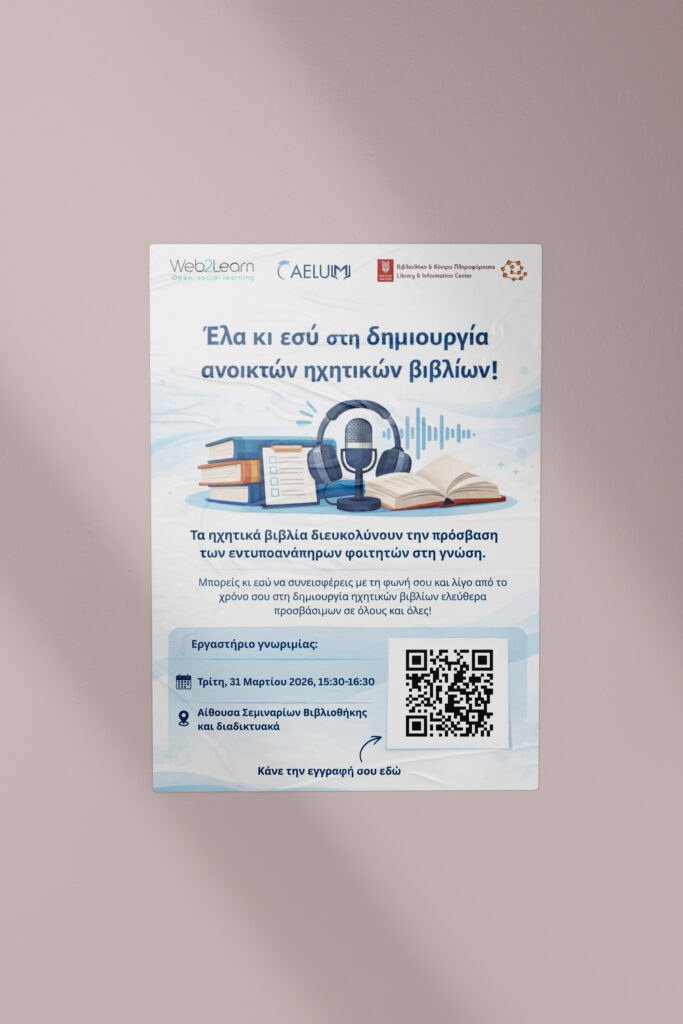 Στο πλαίσιο αυτών των δράσεων, έχει οργανωθεί εργαστήριο που θα λάβει χώρα την Τρίτη, 31 Μαρτίου 2026, από τις 3:30 μμ. έως τις 4:30 μμ., στην αίθουσα Σεμιναρίων της Βιβλιοθήκης του Παντείου Πανεπιστημίου και διαδικτυακά μέσω Zoom. Στο εργαστήριο θα παρουσιαστεί η διαδικασία της παραγωγής ηχητικών βιβλίων και θα μιλήσουν για τις εμπειρίες τους εθελοντές που δημιούργησαν τα πρώτα ηχητικά βιβλία. Μπορείτε να μάθετε περισσότερα για τη δράση εδώ και να κάνετε την εγγραφή σου για το εργαστήριο στις 31 Μαρτίου εδώ.