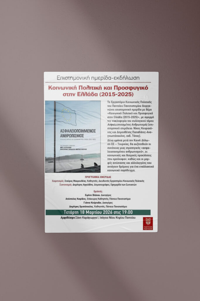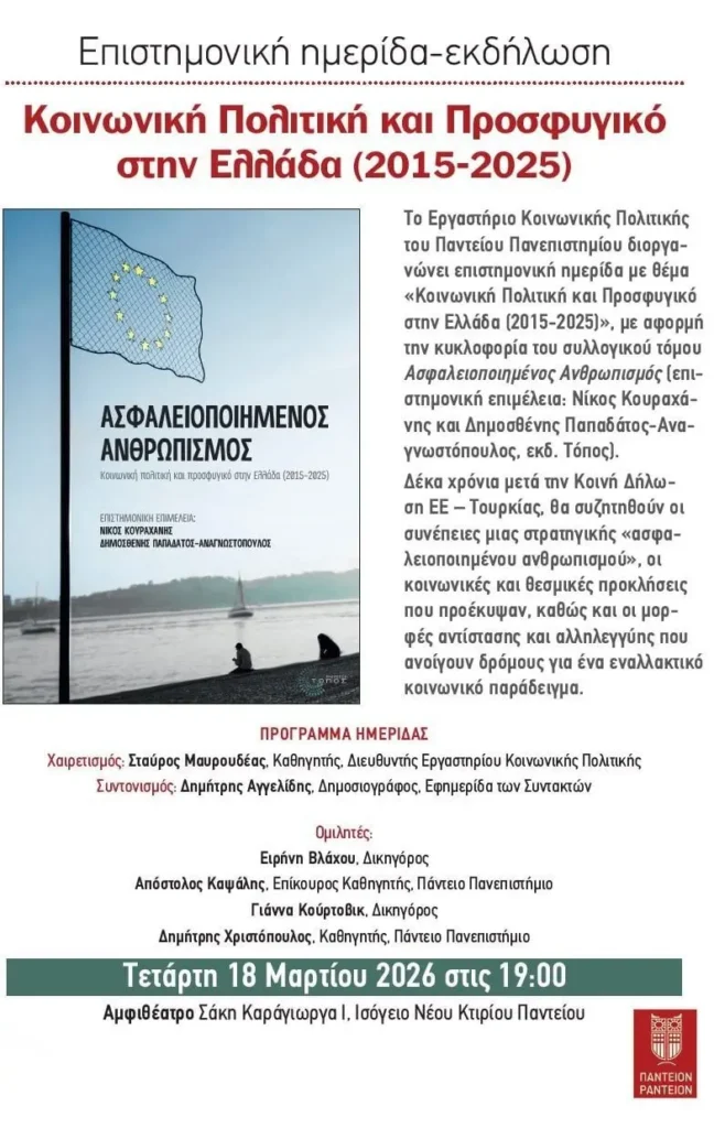 Με αφορμή την κυκλοφορία του συλλογικού τόμου «Ασφαλειοποιημένος Ανθρωπισμός» (επιστημονική επιμέλεια: Νίκος Κουραχάνης και Δημοσθένης Παπαδάτος-Αναγνωστόπουλος), το Εργαστήριο Κοινωνικής Πολιτικής του Παντείου Πανεπιστημίου διοργανώνει επιστημονική ημερίδα με θέμα: